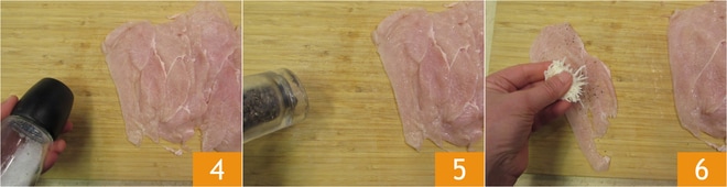 Pegue uma fatia de frango, salgue 4 e apimente dos dois lados 5. Recheie o centro com cerca de 5 g de pecorino e uma pitada de orégano 6.