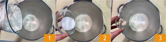Para preparar a massa dos sonhos, coloque na batedeira equipada com gancho a farinha de trigo 00 e a manitoba 1, o açúcar 2 e o fermento biológico fresco esfarelado 3.