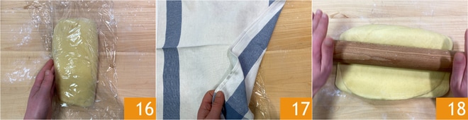 Cubra com filme plástico 16 e um pano de prato 17 e deixe descansar por 10 minutos. Passados os 10 minutos, gire e estenda novamente a massa com o rolo, sempre dando uma forma retangular 18.