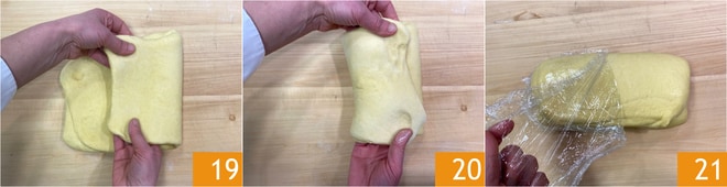 Proceda com mais 2 dobras, começando pela borda direita 19 e depois pela esquerda 20. Deixe a massa descansar 21 por mais 10 minutos, cuidando para cobri-la com filme plástico e um pano de prato, repita mais uma vez as 2 dobras e o descanso de 10 minutos (totalizando 3 vezes).