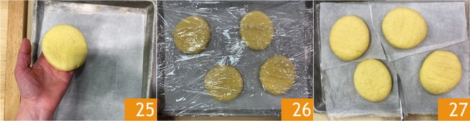 À medida que for cortando, transfira-os para uma bandeja forrada com papel manteiga 25. Uma vez prontos, cubra com filme plástico. Deixe os sonhos crescerem em um local seco por uma hora e meia 26. Enquanto isso, prepare também o creme de confeiteiro. Após o tempo necessário, você notará que a espessura dos sonhos terá aumentado. Corte o papel manteiga ao redor do sonho 27, isso ajudará a mergulhá-los no óleo.