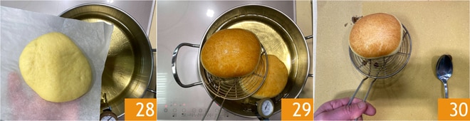 Despeje o óleo de sementes na panela, aqueça-o e, quando atingir a temperatura ideal para fritura de 160°, mergulhe os sonhos um ou dois de cada vez, de acordo com a capacidade da panela, para não abaixar a temperatura do óleo. Deixe-os escorregar do papel manteiga diretamente na panela 28. Com uma colher, despeje óleo quente sobre o sonho para uma cocção uniforme. Frite os sonhos por cerca de 4 minutos, virando-os delicadamente na metade do tempo com a ajuda de uma escumadeira. Quando os sonhos estiverem bem dourados, escorra-os com a escumadeira 29 em uma bandeja forrada com papel absorvente 30.