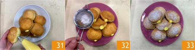 Deixe os sonhos esfriarem um pouco, então recheie-os com creme de confeiteiro usando um saco de confeitar com bico liso e estreito 31. Polvilhe a superfície com açúcar de confeiteiro a gosto 32. Seus deliciosos sonhos estão prontos para serem saboreados 33!
