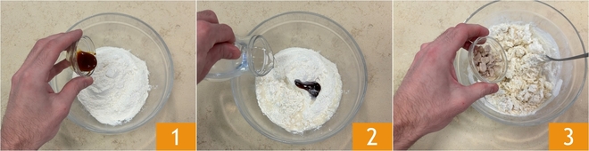 Comece pela preparação da focaccia genovese: em uma tigela, coloque a farinha, o malte 1 e metade da quantidade de água 2. Comece a amassar com um garfo; uma vez absorvido o líquido, adicione um pouco mais de água e o fermento esfarelado 3.