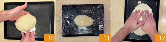 Passado o tempo de descanso, unte uma forma de forno e coloque a massa na forma 10, depois unte também a superfície da massa. Cubra com filme plástico 11 e deixe crescer por 50 minutos à temperatura ambiente. Após esse tempo, espalhe a massa na forma com as mãos 12.