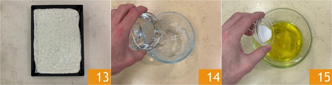 Você deve cobrir toda a superfície; se a massa estiver muito elástica, cubra-a novamente com filme plástico e deixe descansar por mais 15 minutos. Depois de esticado, a focaccia deve crescer por 2 horas no forno desligado com a luz acesa. Enquanto isso, prepare a salmoura: em uma tigela, coloque a água 14, o óleo e o sal 15.