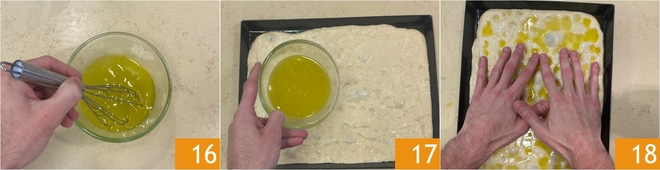 Emulsione com um batedor. Após as 2 horas de crescimento, distribua sobre a focaccia a maior parte da salmoura 17, cuidando em reservar algumas colheres para espalhar após o cozimento. Pressione a massa com as pontas dos dedos para formar os característicos buracos 18.