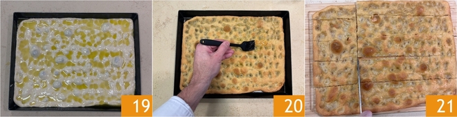 Deixe crescer por mais 15 minutos à temperatura ambiente 19. Asse em forno estático pré-aquecido a 240°C por 18-20 minutos. Uma vez assada, retire do forno e pincele a superfície com a salmoura reservada 20. Finalmente, corte a focaccia genovese em tiras e reserve 21.