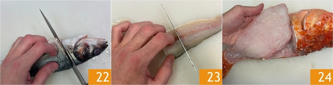 Para preparar a bouillabaisse, comece limpando o peixe, cuidando para conservar todos os resíduos. Como limpar o robalo (spigola): remova a cabeça 22, faça um corte nas costas e eviscere-o, depois retire os filés 23, tire as espinhas e corte os filés em pequenos pedaços 23. Como limpar o tamboril: remova as barbatanas e a cabeça, tire os filés 24 e corte fora a barriga.