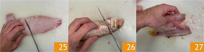 Divida também os filés de rascasso em pedaços menores 25. Cuide dos salmonetes: remova a cabeça 26, faça um corte nas costas e abra-os como um livro para obter os filés 27, depois remova a barriga. Também nesse caso, corte em pedaços.