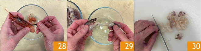 Como limpar os camarões vermelhos: retire a carapaça e deixe a cabeça e a cauda, depois extraia o intestino e reserve-os 28. Para finalizar, Como limpar lulas pequenas removendo a cartilagem interna e as vísceras 29, depois corte em tiras 30.