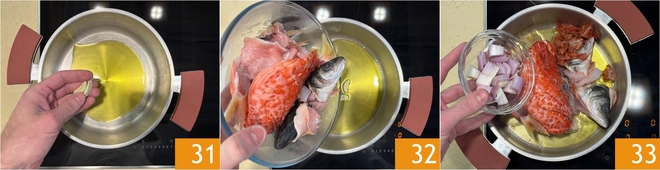 Prepare o Caldo de peixe: em uma panela, coloque um fio de óleo e o alho sem o miolo 31, adicione todos os resíduos da limpeza dos peixes 32 e a chalota descascada e cortada em pedaços 33.