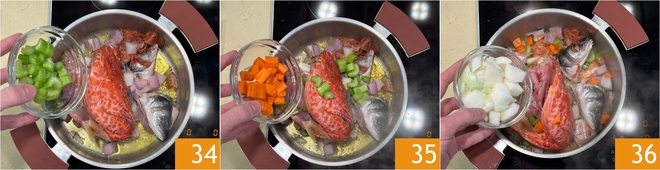 Junte também o restante dos legumes descascados e cortados em pedaços: o aipo 34, as cenouras 35 e a cebola 36.