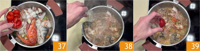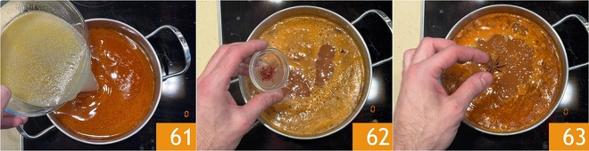 Agora junte ao caldo 300 g da água de cozimento de mexilhões e amêijoas 61, depois coloque novamente no fogo e aromatize com o açafrão 62 e a estrela de anis 63.