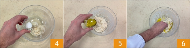Continue misturando, adicionando gradualmente o restante da água. Agora adicione o sal 4 e metade do óleo 5, depois comece a amassar com as mãos 6.