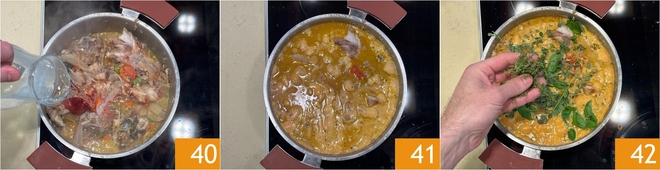 Cubra com água 40 e mexa para dissolver o extrato 41, depois tempere com as ervas aromáticas: o manjericão, a manjerona e o tomilho 42.