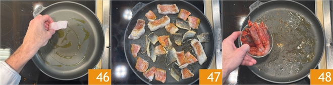 Passe para o cozimento do peixe: em uma frigideira, coloque um fio de óleo, deposite os pedaços de rascasso, salmonetes e robalo 46 e refogue de ambos os lados até dourar 47. Retire-os da frigideira e coloque os camarões vermelhos 48.