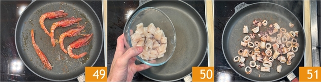 Sauté também estes até dourar 49 e reserve-os. Ainda na mesma frigideira, sele as lulas 50 até dourar 51, depois reserve-as.