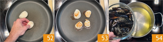Coloque na mesma frigideira as vieiras 52 e refogue até dourar 53. Reserve também estas. Cuide dos mexilhões: em uma panela, aqueça um fio de óleo, depois coloque os mexilhões limpos 54.