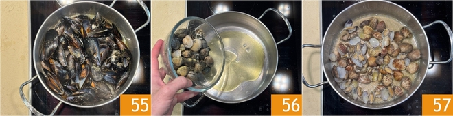 Cubra com a tampa e cozinhe em fogo alto até que se abram 55. Faça o mesmo para as amêijoas 56 e cozinhe apenas o tempo necessário para que se abram 57.