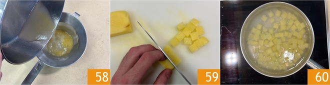 Coe o fundo de cozimento de mexilhões e amêijoas e reserve-o. Agora descasque as batatas e corte em cubos de 1 cm 59. Escalde-as por alguns minutos e reserve-as 60.