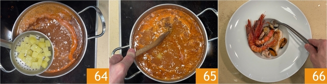 Finalmente, adicione as batatas 64 e continue cozinhando por 2-3 minutos. Tudo está pronto para compor os pratos: no fundo, disponha todos os peixes e crustáceos 66.