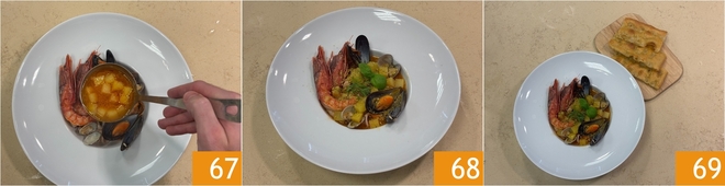Cubra com o caldo 67 e complete com folhas de manjericão, funcho selvagem e farinha de pistache 68. Sua bouillabaisse com focaccia genovese está pronta para ser servida 69!
