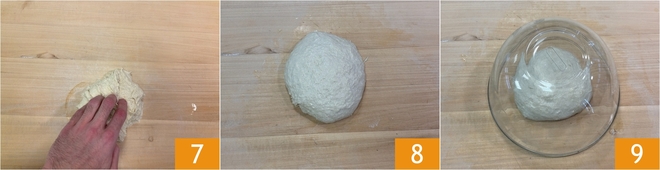 Assim que o óleo for absorvido, transfira a massa para uma superfície 7, dê algumas dobras puxando a massa e dobrando-a sobre si mesma, e aos poucos adicione o restante do óleo. Quando você tiver obtido uma bola lisa e homogênea 8, cubra com a tigela e deixe descansar por 15 minutos à temperatura ambiente 9.