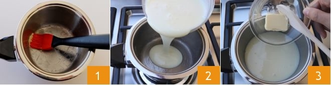 Para preparar os brigadeiros, comece untando uniformemente uma panela com borda alta para evitar que a mistura grude durante o cozimento 1. Despeje o leite condensado na panela e acenda o fogo médio 2. Adicione também 10 g de manteiga 3
