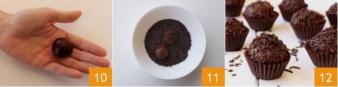 Forme esferas 10 e passe-as em uma tigelinha com confeitos de chocolate 11. Coloque as bolinhas nas forminhas de papel e sirva os brigadeiros 12.