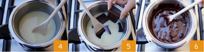 e mexa delicadamente com uma colher de pau para derretê-la completamente 4. Adicione o chocolate amargo em pedaços 5 e mexa de vez em quando, cozinhando a mistura por 15 minutos: ela deve alcançar uma consistência cremosa, compacta 6 e se desprender do fundo da panela.