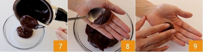 Transfira a mistura para uma tigela 7 e deixe esfriar em temperatura ambiente. Com uma colher, retire cerca de 20 g de mistura 8 e role-a entre as mãos levemente untadas de manteiga 9: com essas quantidades, você obterá cerca de 20 docinhos.