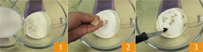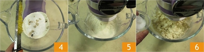 e a casca ralada de um limão 4. Em seguida, ligue a batedeira em velocidade moderada e adicione a água aos poucos 5. Quando estiver bem absorvida, acrescente o sal 6