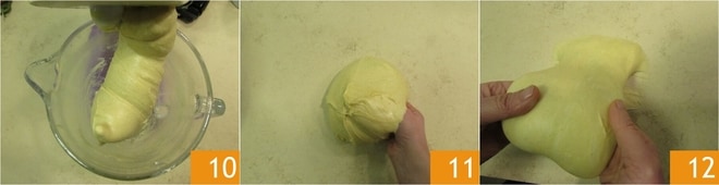 Quando a massa estiver novamente incorporada 10, transfira-a para uma superfície 11. Pode estar muito pegajosa: dê algumas dobras tipo slap & fold, sem bater. Para fazer isso, basta levantar a massa delicadamente, esticá-la e dobrá-la sobre si mesma 12. Se estiver muito pegajosa, espere dois minutos e repita o processo de dobradura.