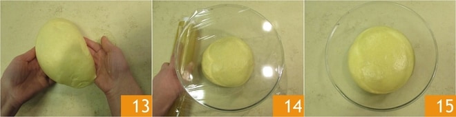 Em seguida, enrole a massa ajudando-se de uma espátula para soltá-la bem da superfície e formar uma esfera 13, transfira-a para uma tigela grande. Cubra com filme plástico 14 e deixe a massa levedar a uma temperatura entre 26 e 28°C por 3 horas e meia. O ideal seria no forno desligado com a luz acesa e uma panelinha de água quente colocada no fundo do forno. Se não tiver essa opção e deixar em temperatura ambiente, protegido de correntes de ar, com uma temperatura inferior à indicada, pode ser necessário um tempo maior. Quando a massa tiver dobrado de tamanho 15,