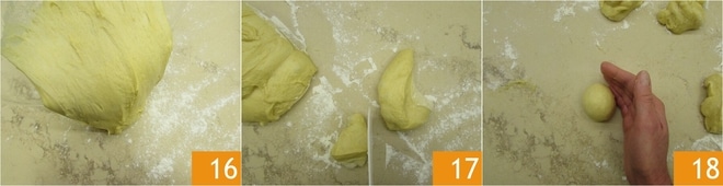 vire-a sobre a superfície de trabalho 16 e separe 18 pedaços de 50 g 17. Pegue a primeira porção e dê força à massa fazendo rapidamente algumas dobras, levantando então uma aba externa da massa e levando-a ao centro. Repita esta operação várias vezes. Enrole os pedaços de massa rapidamente para formar bolinhas 18.