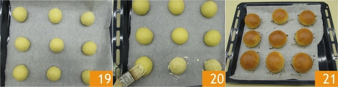Coloque em uma assadeira forrada com papel manteiga 19. Deixe levedar por mais uma hora. Bata a gema com um pouco de creme de leite e use-a para pincelar a superfície 20. Asse em forno estático pré-aquecido a 180°C por 20 minutos. Retire do forno 21, deixe amornar e sirva.