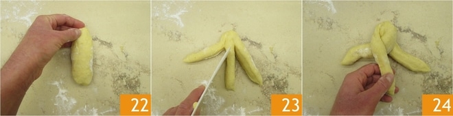 Como alternativa às bolinhas, também é possível criar tranças. Nesse caso, você precisará de uma quantidade maior de massa. Para cada trança, serão necessários cerca de 90-100 g. Modele a massa para obter um filão 22 e use uma faca ou uma espátula para cortar o filão de modo a obter 3 tiras unidas na base, então não deve cortá-las até o final 23. Comece a trançar as extremidades 24