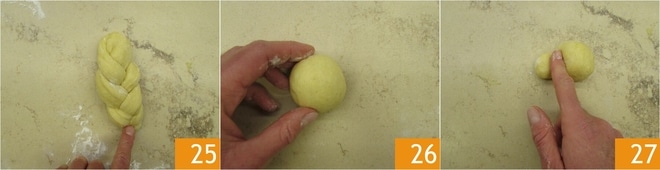 para obter suas tranças 25. Além das tranças, você também pode fazer pequenas brioches com o tufo. Pegue cerca de 40-50 g de massa e forme uma bolinha 26. Depois, com o dedo indicador, modele a bolinha para obter duas, sendo uma menor 27.