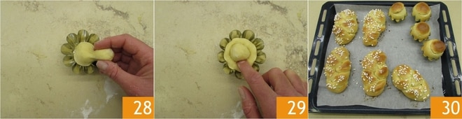 Transfira para dentro de uma forminha frisada 28 e pressione levemente a parte inferior 29. Deixe então levedar tanto as tranças quanto as brioches com o tufo por uma hora, pincele a superfície com gema e creme de leite e decore as tranças com açúcar granulado. As tranças terão um tempo de cozimento maior (cerca de 25-30 minutos), enquanto para as brioches com o tufo bastarão 20 minutos. Retire do forno 30, deixe amornar e sirva!