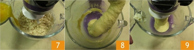 e as gemas, pouco a pouco, esperando que sejam absorvidas antes de prosseguir com as restantes 7. Continue a trabalhar até que a massa esteja bem incorporada ao gancho 8. Só nesse ponto você poderá adicionar a manteiga amolecida, mas ainda moldável, também pouco a pouco 9. Espere que um pedaço seja bem absorvido antes de adicionar outro. Não tenha pressa, caso contrário, a massa terá dificuldade em se incorporar novamente. Nessa fase, você pode parar a batedeira várias vezes e usar uma espátula para soltar a massa que tende a grudar na tigela da batedeira.