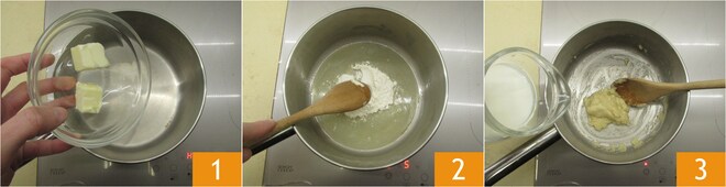 Para preparar os brócolis gratinados, comece pelo molho béchamel caseiro: derreta a manteiga em uma panela em fogo baixo 1. Adicione a farinha de uma vez só 2 e cozinhe por um minuto, tomando cuidado para não grudar no fundo, mexendo com uma colher. Despeje o leite em três vezes, à temperatura ambiente 3.