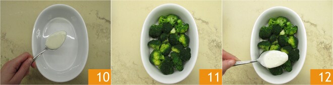 Despeje um pouco de molho béchamel no fundo de uma assadeira 10, adicione uma primeira camada de brócolis 11 e mais molho béchamel 12.