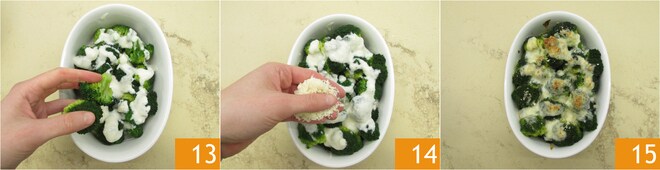 Faça uma segunda camada com os brócolis restantes 13 e o molho béchamel, tempere com o queijo ralado 14. Asse em forno estático pré-aquecido a 200°C por 17 minutos, depois passe para o grill a 230°C por 4-5 minutos. Sirva os brócolis gratinados quentes 15.