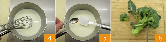 Deixe engrossar mexendo com o batedor 4, você deve obter um molho espesso e sem grumos. Tempere com sal, pimenta e noz-moscada 5. Limpe os brócolis, retirando as flores 6 e lave-as.