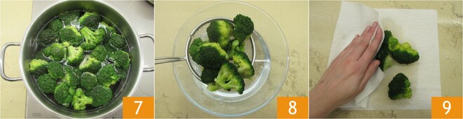 Branqueie as flores em água salgada por 6 minutos 7, depois escorra-as em uma bacia com água e gelo 8. Seque os brócolis com um pano 9.