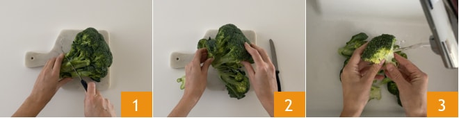 Para preparar os brócolis na frigideira, comece destacando o talo, que não será necessário 1, das flores 2: no total, você deve obter cerca de 425 gramas de brócolis. Enxágue as flores sob um jato de água fresca 3.
