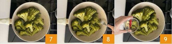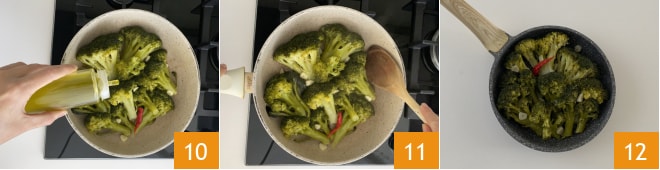 despeje o azeite de oliva extra virgem 10 e deixe apurar em fogo alto por 2-3 minutos de cada lado 11. Aqui estão seus brócolis na frigideira prontos, aprecie-os quentes ou frios 12.