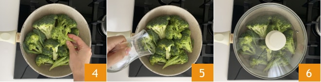 Coloque os brócolis dentro de uma frigideira 4 e despeje a água 5, cubra com uma tampa e leve para ferver 6.