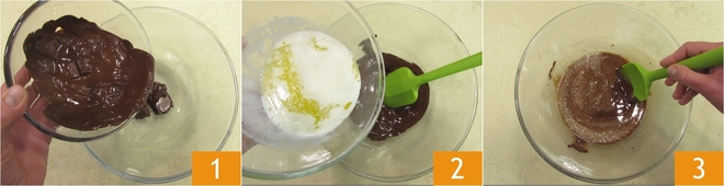 Para preparar os brownies, primeiro pique e derreta o chocolate amargo em banho-maria ou no micro-ondas e despeje-o em uma tigela 1. Derreta também a manteiga e adicione-a ao chocolate derretido 2, depois mexa vigorosamente com uma espátula de silicone 3 e deixe esfriar.